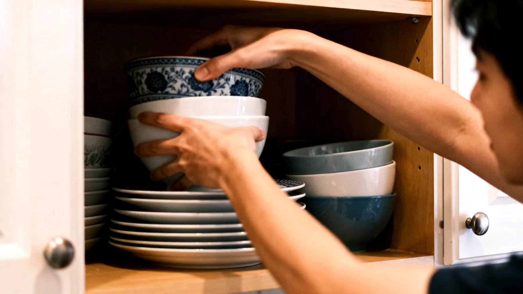 Eine weitere ergonomische Überlegung: Schüsseln nicht direkt unter Hängeschränken lagern, in denen andere Gegenstände beim Herausziehen stören könnten. Jede Barriere über dem Stapel erhöht die Gefahr, dass beim Schwenken eine Kante anschlägt. Frei zugängliche, übersichtliche Regalordnung verhindert solche Unfälle.